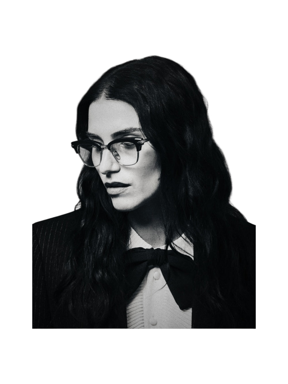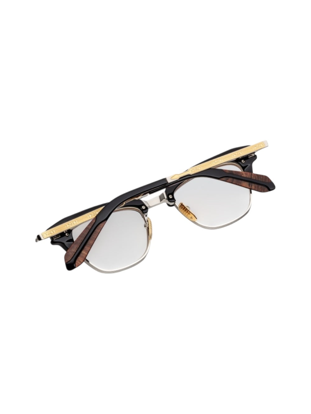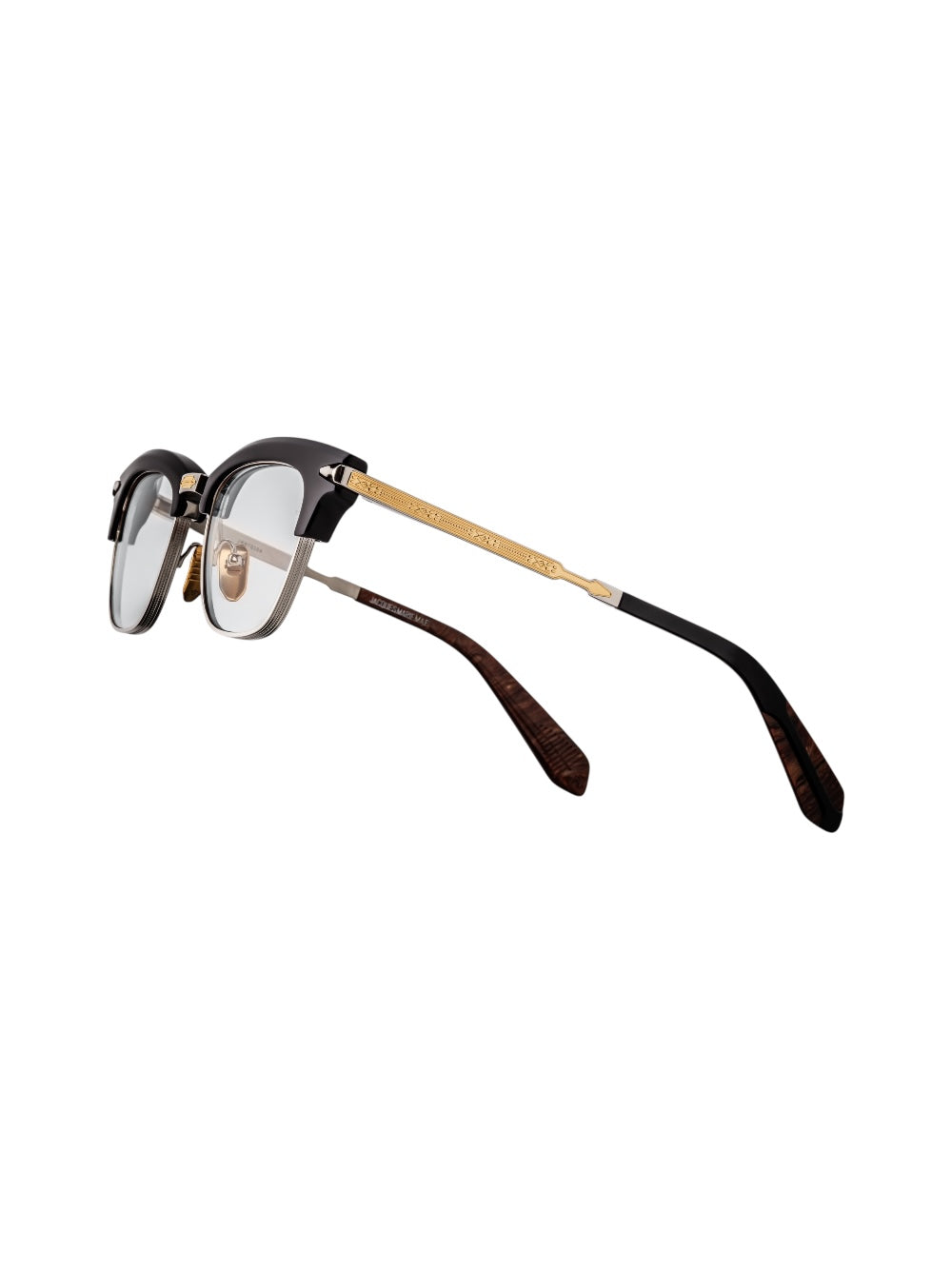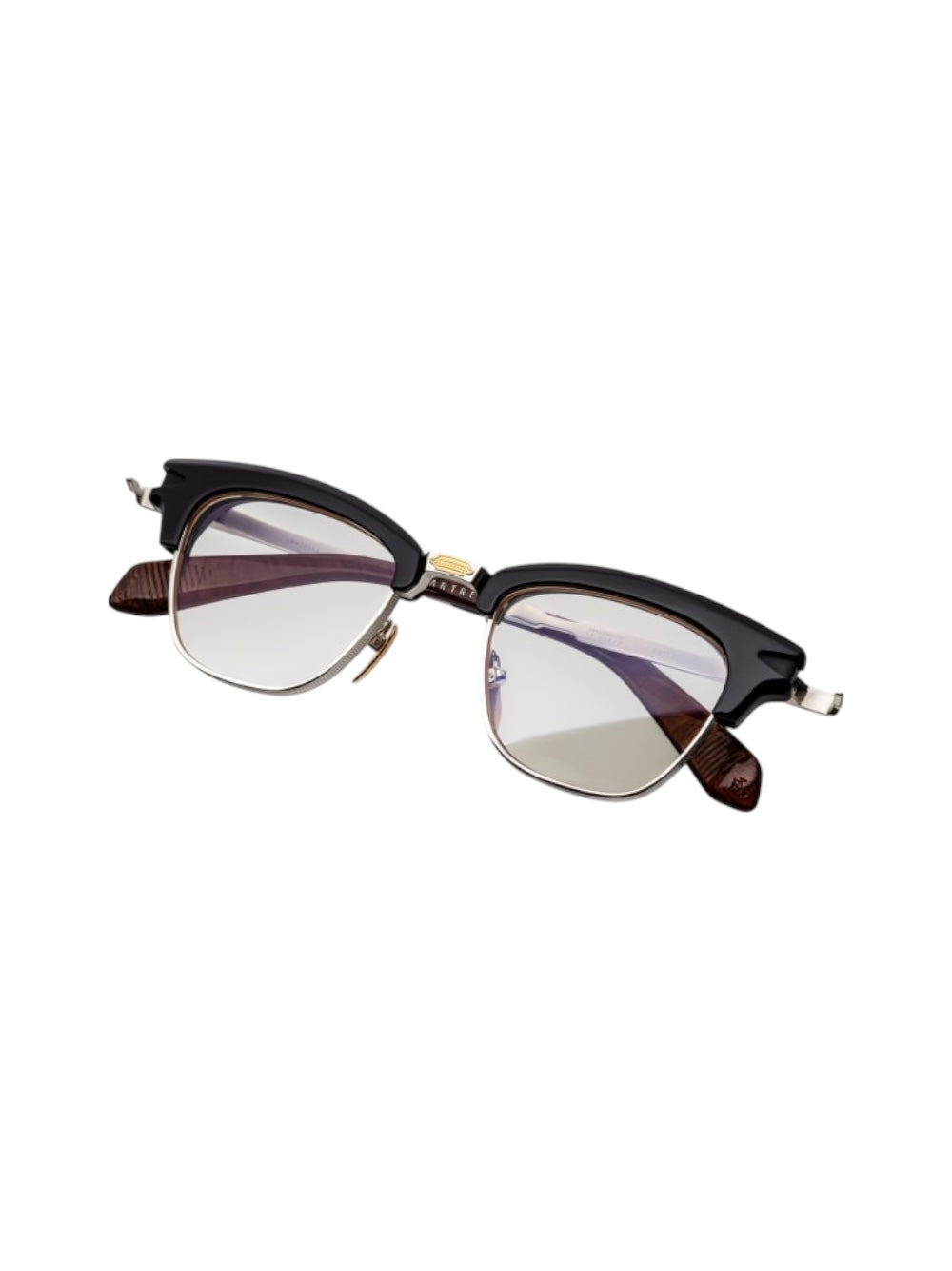 Classic '50s-inspired combo spectacles with prominent 10mm acetate brow, round titanium eye rims, our signature arrowhead monoblock hainges, and finely engraved titanium temples with a unique arrwhead motif and acetate temple tips.